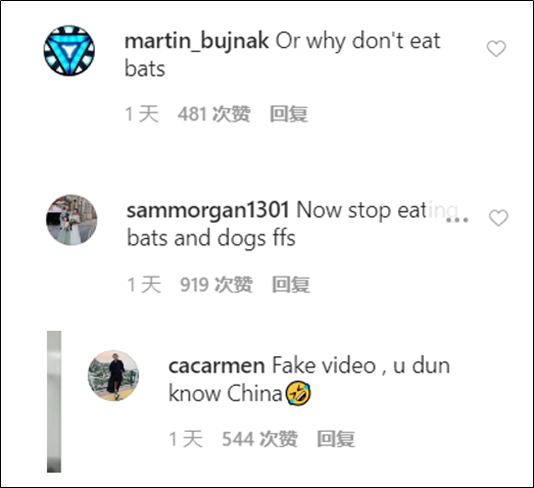 好几条高赞评论称:“你们就不能别吃蝙蝠吗?”、“别吃蝙蝠和狗肉了”。也有评论拿出“没人比我更懂中国”的架势卖弄说:“视频是假的,你根本不知道中国是什么样子”。
