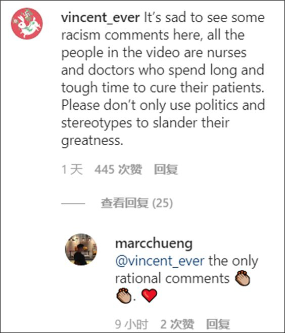 “看到这么多充满种族主义的言论,我很难过,视频里的人都是医生和护士,他们已经在一线,为救治病人艰苦奋战很久了。请不要拿政治和刻板印象贬低了他们的伟大。”