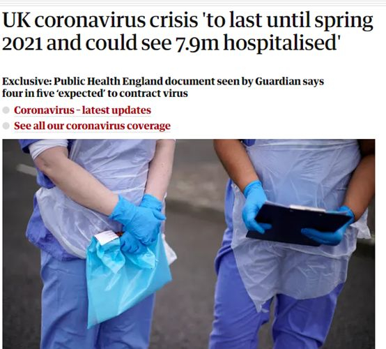 根据《卫报》的报道,这份英国卫生部下属的“英格兰公共卫生署”(Public Health England)于近日传达给英国卫生系统高官的“秘密”简报显示,英国新冠病毒疫情或将一直持续到明年春天,并将导致790万人因感染住院。