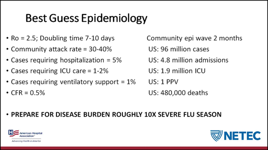 美国医院协会新冠肺炎研讨会的幻灯片显示专家对疫情的最佳预测——美国将会出现多达9600万个确诊病例、480万人需要住院治疗,最终将会有48万人因此丧命,新冠疫情对于医疗系统的冲击将会是严重流感季节的数十倍(Business Insider)