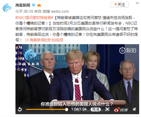 当地时间3月20日美国白宫举行新闻发布会,NBC记者质问特朗普想对数百万深陷恐惧的美国民众说些什么?这一提问激怒了特朗普,特朗普回应说:你是个糟糕的记者!你在向美国民众传递很不好的信号!