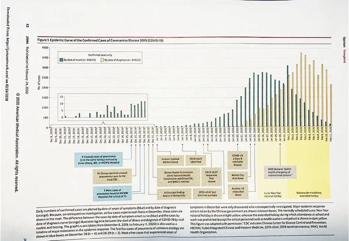 美国医学会杂志上的学术文章曾刊发一张图表,图上显示1月23日,在武汉封城时,有近400例新冠病例,但是实际上在那时,有接近2500位病毒携带者。
