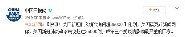 美国新冠肺炎确诊病例超35000 新浪新闻 新浪新闻官方账号 2020.03.2320:46 关注 原标题:快讯!美国新冠肺炎确诊病例超35000 来源:中国日报网 刚刚,美国福克斯新闻网称,美国新冠肺炎确诊病例超过35000例,成第三个受疫情影响最严重的国家。