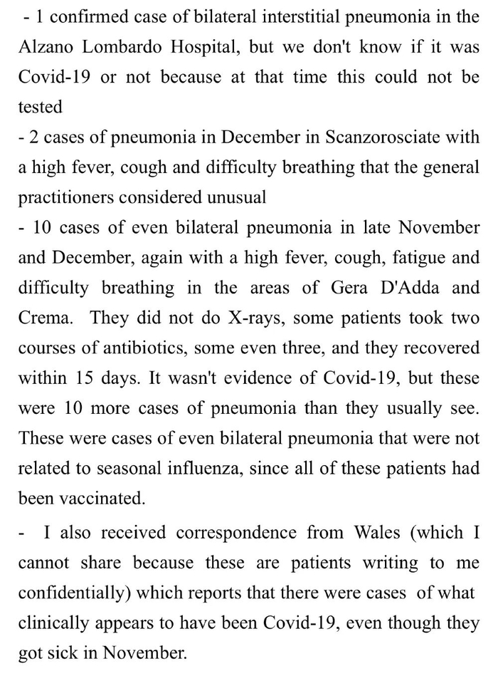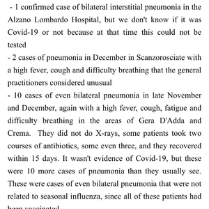 But what he knows for sure is that there were indeed patients with strange symptoms suspected to be COVID-19。 Over 10 cases in Scanzorosciate, Gera D‘Adda and Crema, Italy, developed high fever, cough, fatigue, and difficulty breathing that were not related to seasonal influenza, since all of these patients had been vaccinated。