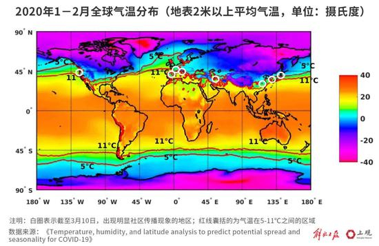 结果发现,目前新冠病毒疫情在世界地图上主要沿东西向分布,纬度在北纬30度-50度之间。且这些国家在11月-2月间有着相似的气候条件:温度分布在5摄氏度-11摄氏度之间,相对湿度在44%-84%,同时有比较低的比湿度(3-6 g/kg)和绝对湿度(4-7 g/m3)。