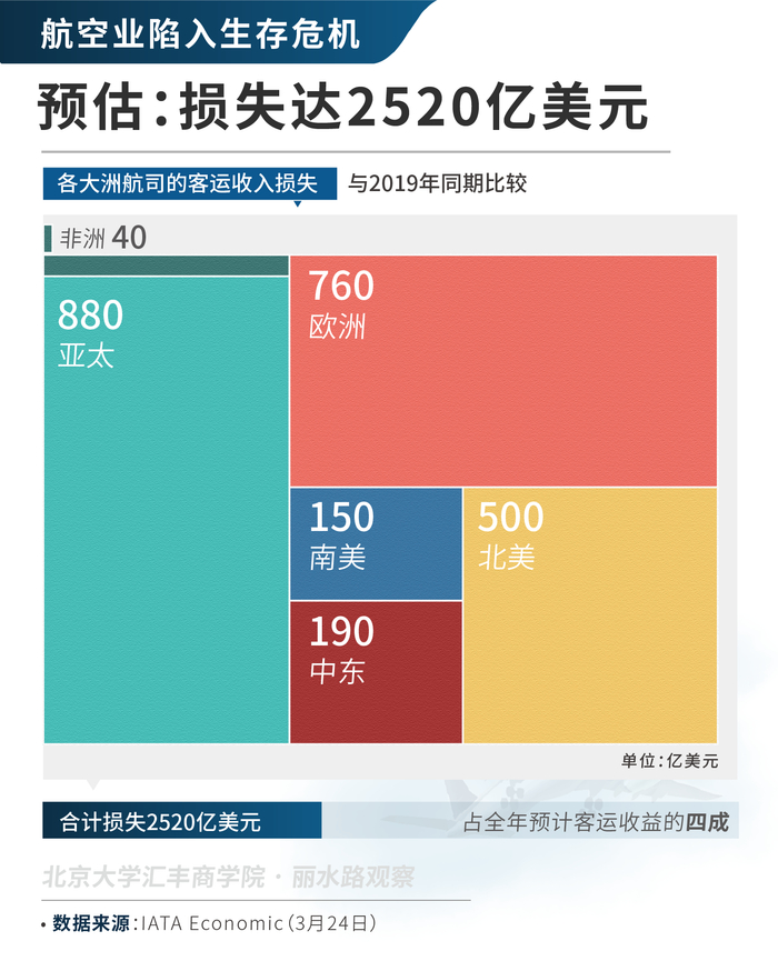 其中,亚太、欧洲和北美地区的损失预估分别达到了880亿、760亿与500亿美元,并会因为疫情持续而继续增长。而这三个市场,本身就占据了世界航空业市场总额的近八成。