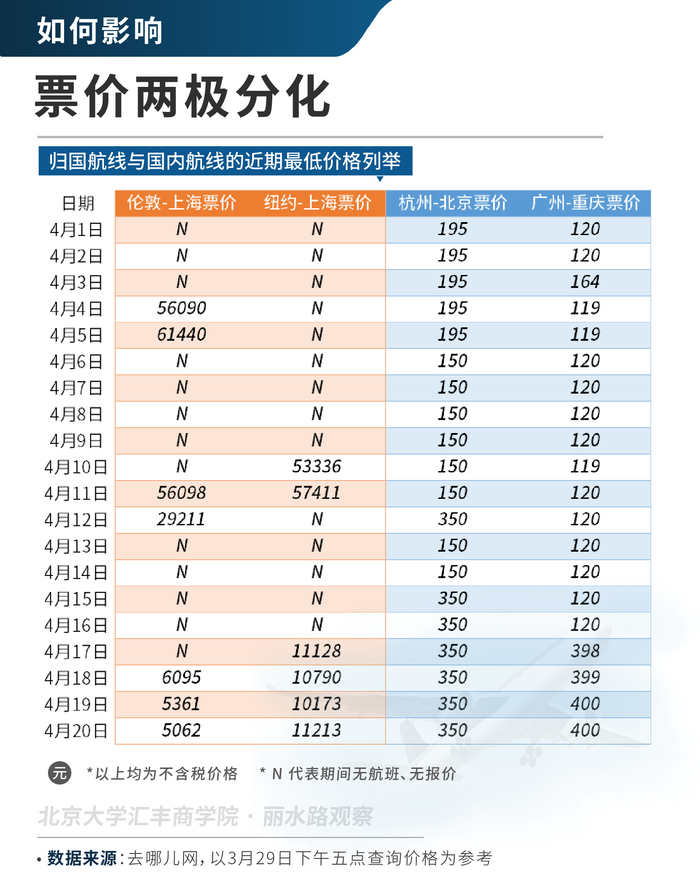 这与国内航班的票价形成两极分化。由于各地人口流动减少,部分国内航线出现极低报价,广州至重庆、杭州至北京的四月机票价格多在百元,不足一折。
