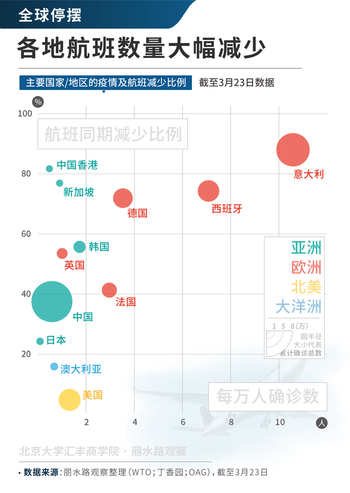 从上图可以看到,在疫情最为严重的意大利、西班牙等地区(每万人确诊数最多),航班减少的比例也相对较高。中国、美国等国总确诊数虽多,但每万人确诊数相对较少,航班减少的比例较低。而新加坡、中国香港地区,作为国际航班的重要中转枢纽,虽然确诊比例不高,但航班数量与同期相比依然出现了锐减态势。