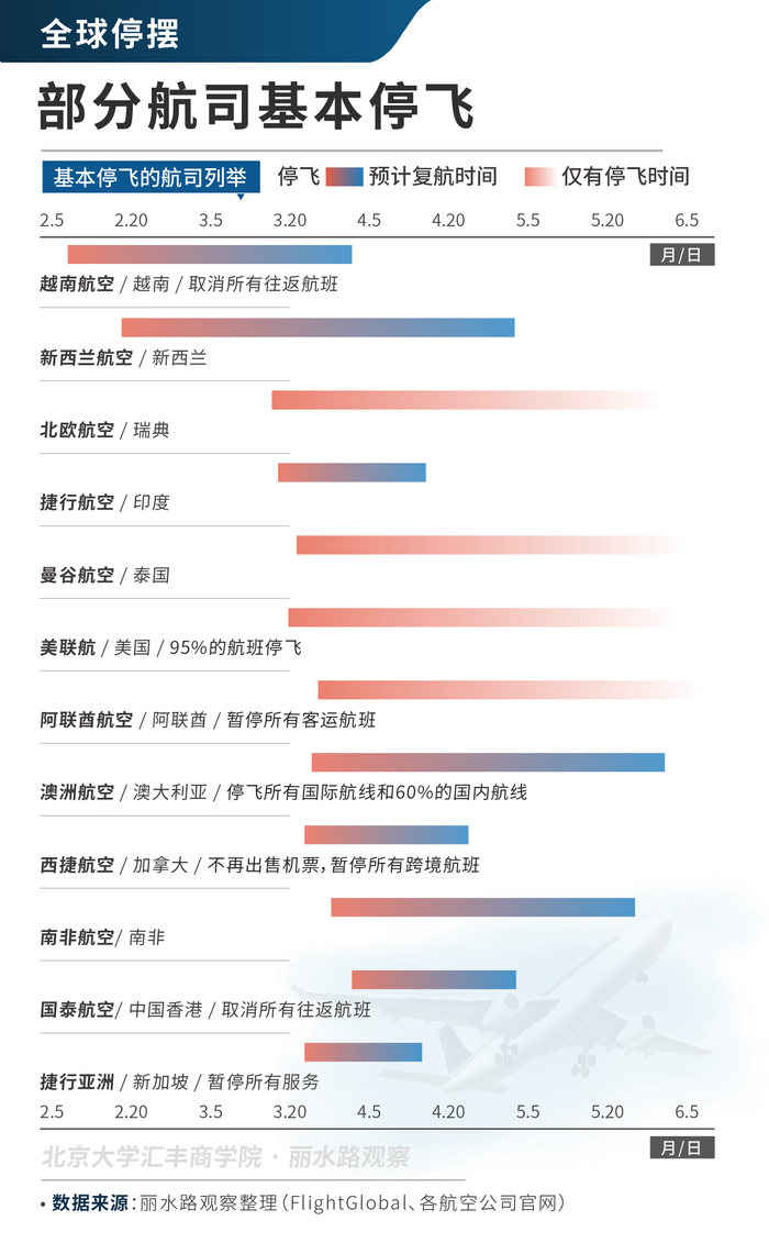 停飞起始时间集中在三月中旬,即新冠病毒全球传播的关键期。预计复航时间,已推迟至五月。