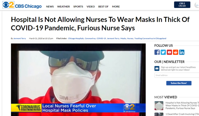 美国CBS新闻网3月31日就报道说,另有一名在芝加哥一所医院工作的护士对媒体爆料说她所工作的医院不让她戴口罩,甚至还将口罩都锁了起来,并有视频监控着。