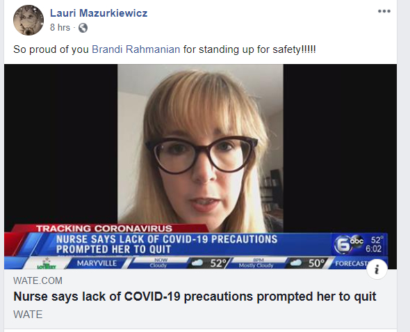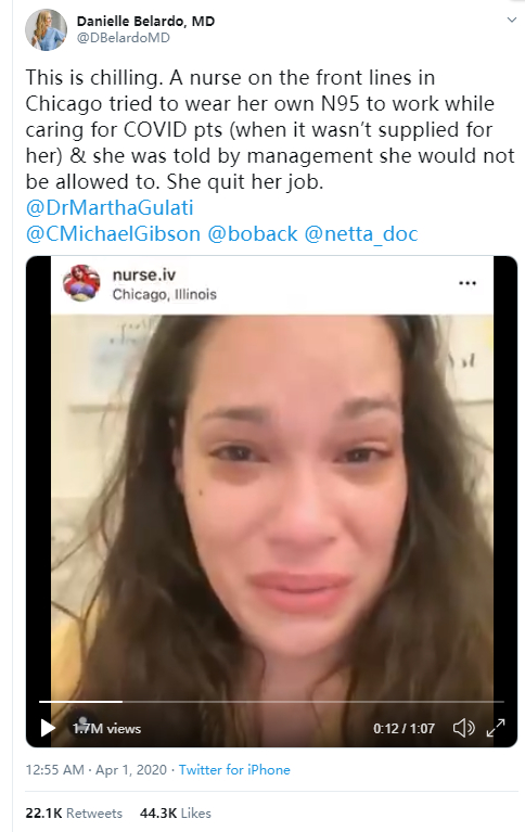 比如下图中这位被她转帖的报道中的护士,来自美国田纳西州的一家医院。这名护士表示因为医院要求她照顾新冠病毒的疑似感染者,却又不给她配备N95口罩,甚至还要求她反复使用缺乏保护性的普通医用口罩,所以不得不选择辞职。