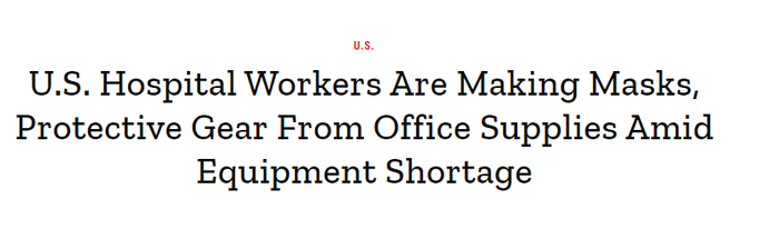 不过,医护人员的防护设备严重短缺在美国已经不是什么“新”闻了。在3月中旬,美国《时代》周刊以及VOX新闻网等媒体,都曾报道过这个问题。其中《时代》周刊的报道就指出,一些地方的医护人员不得不使用从市场里买来的非医用材料自制防护装备了。