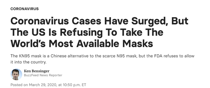 尤其令Buzzfeed记者不解的是,在美国疾控中心于2月底已经表示KN95口罩可以用来填补N95口罩的短缺,以及N95口罩的主要生产商3M公司也表示KN95可用于替代N95口罩之后,美国FDA仍然没有给这种在中国生产、且价格比N95口罩便宜一倍多的口罩开绿灯。
