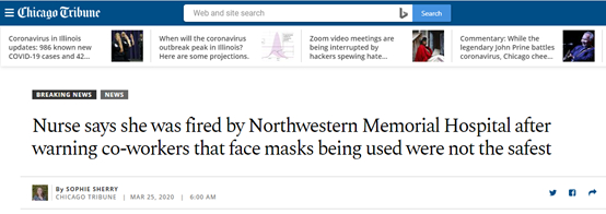 《芝加哥论坛报》在3月25日也报道了类似的案件:一位名叫Lauri Mazurkiewicz的护士,因为不满医院在接诊新冠病毒感染者时只允许护士们佩戴普通外科口罩,给50多名同事发了邮件,让他们佩戴N95口罩,不要再用医院提供的缺乏保护性的口罩,她自己也佩戴了N95口罩去上班。结果,她竟因此被医院开除了……