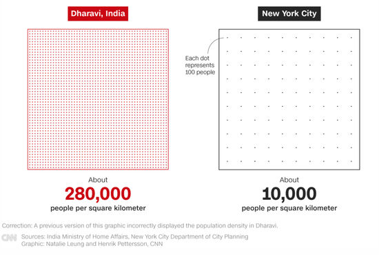 CNN对比了印度贫民窟Dharavi和纽约的人口密度,这里有大量民众生活在不卫生的环境中。这个人口密度是每平方公里28万人的贫民窟,在前段时间出现了感染病例。
