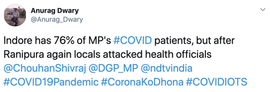 Twitter上的一则视频,拍摄了印度中央邦印多尔,一名暴徒向两位身着防护服的女医生扔石头的场面。