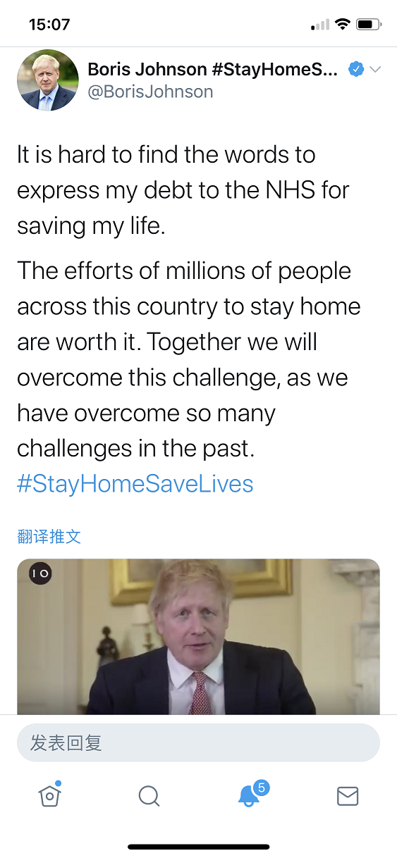 当地时间12日下午15:00,刚刚出院不久的英国首相鲍里斯·约翰逊在个人社交媒体上传了一段5分钟的视频及一段文字,称“此刻我很难用语言表达我对NHS医务人员的感激之情,他们挽救了我的生命,我欠他们一条命。全英国数百万人“待在家里”的努力是值得的,我们曾经一起克服了很多挑战,现在我们将共同克服这个挑战。”