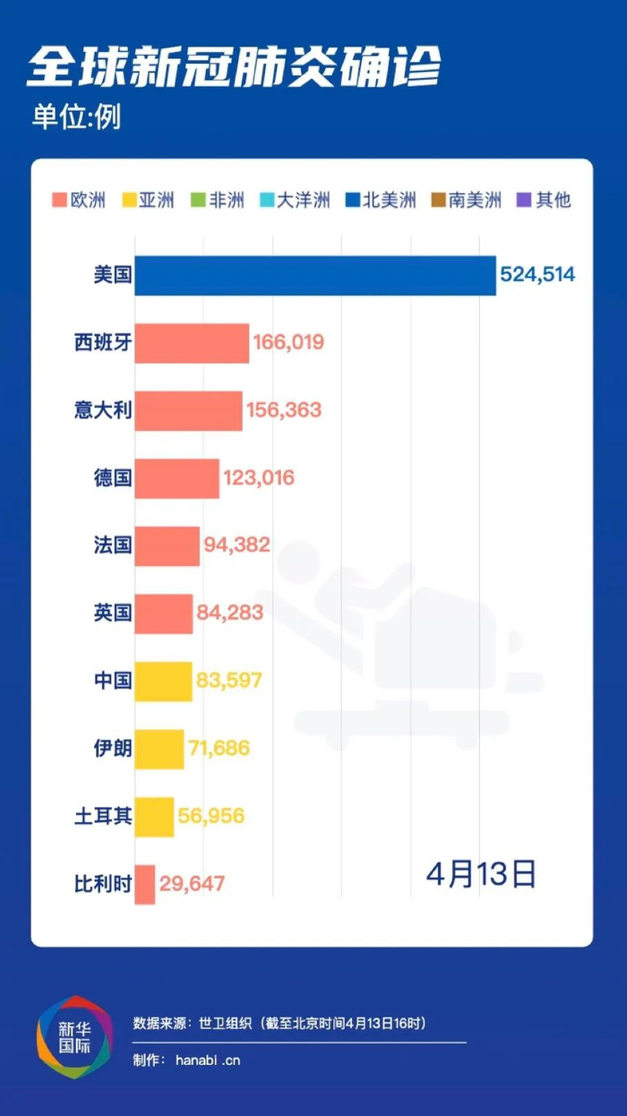以世卫组织4月13日公布的疫情数据为例,西班牙、意大利、德国、法国、英国、比利时仍名列欧洲确诊病例最多的前列。不过,西班牙单日新增病例数为3月21日以来最低值,意大利重症病例连续第十天下降,法国重症病例和英国新增死亡病例均比前一日有所下降。德国累计治愈人数超过现存病例数。