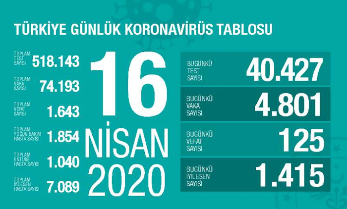 当地时间4月16日晚,土耳其卫生部网站更新的数据显示,当天进行了40427次新冠病毒检测,其中4801人检测结果呈阳性。至此,土耳其累计确诊74193例。16日当天新增125例死亡病例,新增死亡1643例。当天治愈1415例,累计治愈7089例。目前土耳其总计进行了518143次检测,目前重症监护患者1854例,插管患者1040例。