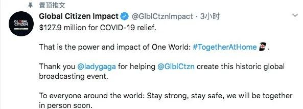 主办方“全球公民”在推特上称,已为世界卫生组织筹得1.279亿美元美元用于抗击新冠疫情