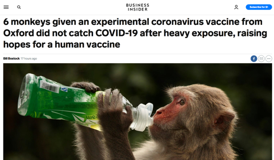 事实上,全世界第一个在恒河猴身上得到有效结果的疫苗,是中国的北京科兴中维。许多中外媒体都在报道中提到过。