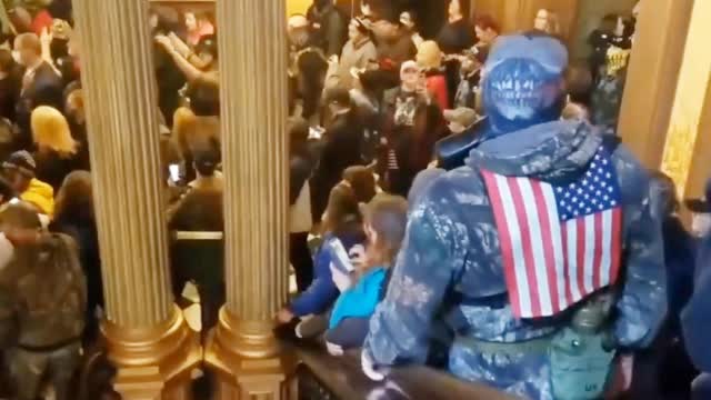 美国密歇根州示威者持枪进入议会大厦抗议。(图源:推特)