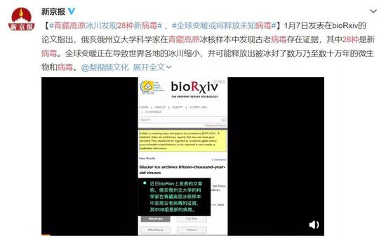 1月7日发表在bioRxiv的论文称,俄亥俄州立大学科学家在青藏高原冰核样本中发现古老病毒存在证据,其中28种是新病毒。该研究表明,全球变暖导致世界各地冰川缩小,并可能释放被冰封了数万乃至数十万年的微生物和病毒。