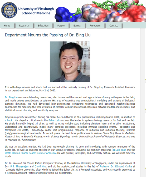 根据“今日美国”的报道,死者Liu Bing曾在新加坡国立大学获得的计算科学博士,之后来到美国发展,先是在卡内基梅隆大学读博士后,然后来到匹茨堡大学成为了助理研究员。他的同事说他是个非常高产的研究员,已经发表过30多篇论文。