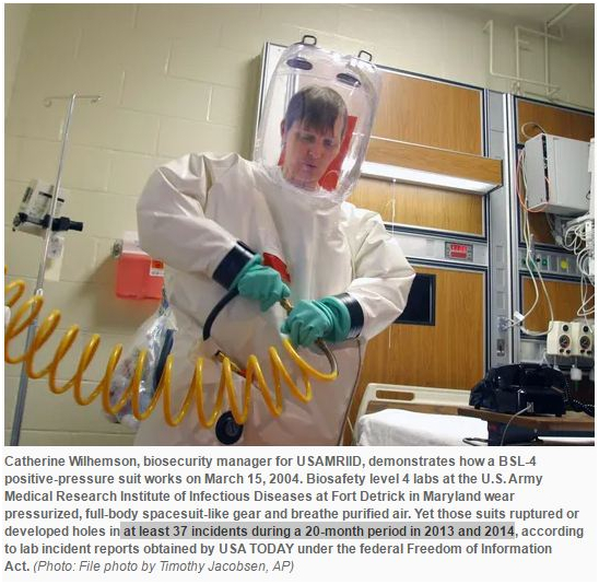 2014年的防护服破损事故。 《今日美国》报2015年根据联邦《信息自由法》获得的实验室事故报告显示,RIID的防护服在2013年和2014年的20个月内,至少出现过37起破裂或穿孔事故。