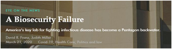 今年3月,美陆军退役上校戴维·弗兰兹在和《细菌:生物武器和美国的秘密战争》作者朱迪思·米勒联合署名的一篇文章中直言了RIID的管理不善。