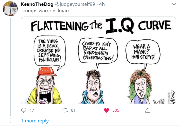 另外,有厌恶特朗普的网民也在他的评论区里用一张漫画讽刺说:下面这些说着新冠病毒是政治阴谋、新冠肺炎一点都不可怕,带口罩很蠢的人,就是你的“键盘侠”吧?
