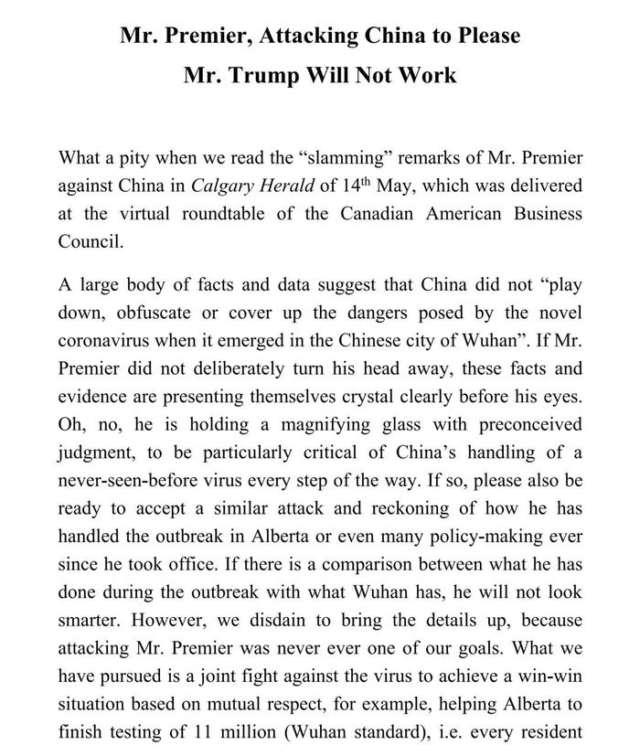 据驻卡尔加里总领馆消息,卡尔加里先驱报5月14日刊登了省长先生在加拿大美国商业理事会虚拟圆桌会议上的讲话,其中有大段跟风特朗普先生关于追责中国抗疫努力和制造业回流的言论。我们对此感到非常遗憾。