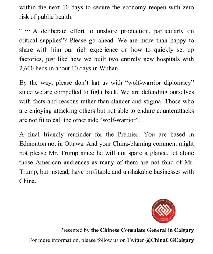 大量事实和数据表明,中国并没有在新冠肺炎疫情爆发初期淡化、混淆或掩盖其危险性。省长先生如非存心不想看,这些事实和证据将会非常清楚地呈现在他眼前。不,他是在拿着放大镜并以先入为主、挑剔追责的心态,苛求中国在探知如何应对一个全新病毒过程中的每个细节。那么,也请他做好准备,接受别人以同样的方式,对他应对阿省疫情、甚至就任省长后制定的多项政策进行挑剔和追责。如果把省长先生在阿省疫情爆发初期的反应与武汉市同期的反应两相比较,他并不显得更睿智。但是,我们无意挑明这些细节,因为攻击省长先生从来不是我们的目标。我们追求的是在相互尊重的前提下共同抗疫,实现共赢。例如帮助阿省在未来十天内完成1100万份新冠肺炎病毒检测(武汉标准),从而为阿省经济重启提供公共卫生安全保障。