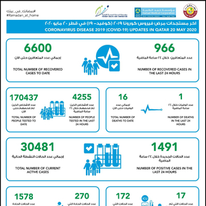 卡塔尔公共卫生部5月20日下午对外公布,在过去的24小时中,卡塔尔全国共有1491例新增新冠肺炎确诊病例,总确诊病例达37097例。当天卡塔尔还新增1例死亡病例,累计死亡病例达16例。此外,卡塔尔当天还有966名治愈患者,单日治愈人数创新高,总治愈人数达6600例。目前仍有30481人处于治疗中,其中1578人住院治疗,172人在重症监护室中。卡塔尔当天还对4255人进行了检测,总检测人数为170437,确诊人数约占总检测人数的五分之一。(总台记者 张雨辰)