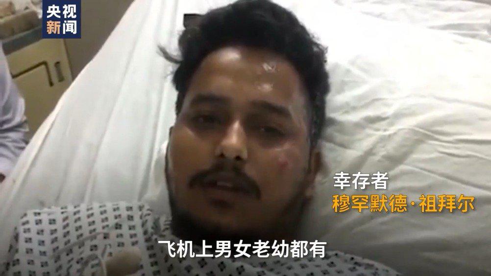 在央视播发的一段新闻视频中,坠机事故幸存者穆罕默德·祖拜尔讲述了自己所经历的可怕一幕,“当飞机再次试图从跑道上拉起时,机上乘客哭喊成一片。每个人都在祈祷,之后飞机就起火了,我的座位号是8F,飞机起火的时候,我解开了安全带,看到了火光,我从飞机里面出来,从大概10英尺(约3米)高处跳下来,之后救护车就来了,然后把我送到了这家医院。”