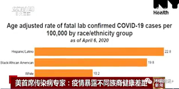 美国国立卫生研究院的非洲裔免疫学家科比特曾暗示,医院在呼吸机不足的情况下会最先放弃对黑人的插管治疗。美国首席传染病专家福奇也指出,非洲裔群体中糖尿病、高血压、肥胖症、哮喘等基础病患者比例较高,而新冠肺炎对此类人群的威胁恰恰更大。此外,由于非洲裔群体医保覆盖率更低,一些人在确诊感染后无法及时获得医疗服务,这也导致这一群体病亡率较高。