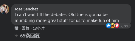 网友Sanchez写道:“我等不及要看两人辩论了。岁数不小的乔还会咕咕哝哝地说更多好玩的东西,以让我们继续取笑他。”↓