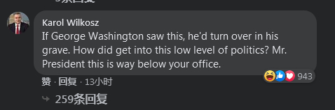 网友Karol Wilkosz评论说,“如果乔治·华盛顿看到这个视频,他一定会死不瞑目。(美国)到底是怎么进入这种低级政治的?总统先生,这种做法与你的职位相比太低级了。”↓