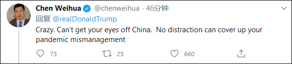 《中国日报》欧盟分社社长陈伟华也评论了特朗普的这条推特,他写道:太疯狂了,你从来都不曾把视线从中国身上移开,任何“甩锅”动作都掩盖不了你在疫情大流行期间抗疫不力的事实。