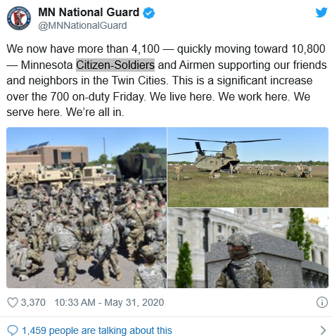 明尼苏达国民警卫队在推文中写道,该州国民警卫队有4100多名公民士兵(Citizen-Soldiers)和飞行员对明尼苏达州的抗议活动作出反应。预计10800名国民警卫队成员将加入响应。“我们在这里生活,我们在这里工作,我们在这里服务。我们全部待命。”