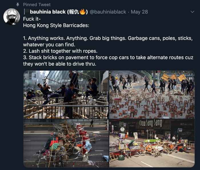 其实,境外社交媒体上活跃的“经验分享”账号并不只有kylie⁷,账号@hwaslintroller用带文字的图片详细讲解“如何逃脱追踪”“被捕贴士”等信息。名为“bauhinia black (报仇)”的账号则用图片和视频来讲解怎样设置“港式路障”。