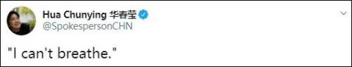 华春莹回怼的这句话,正是“黑人之死”事件主人公弗洛伊德遭白人警察“膝盖锁喉”时的求救话语。弗洛伊德被警察用膝盖压在地面上至少7分钟,在这期间弗洛伊德不断哀求“我不能呼吸了(I can‘t breathe)!别杀我!”,但警察并没有停手。最终弗洛伊德被送医后不久便死亡。