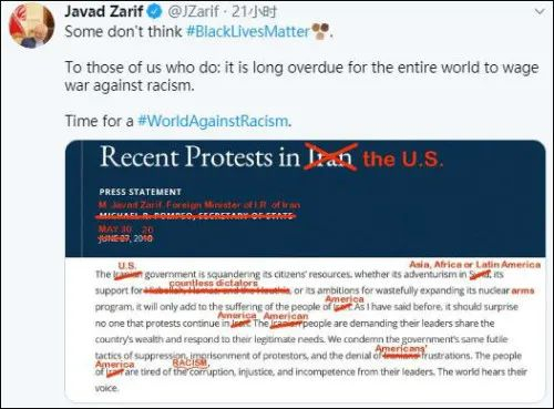 扎里夫在这条推文中评论说:“有些人不认为‘黑人的命很重要’,对于我们这些人来说,全世界早就该向种族主义宣战了。”