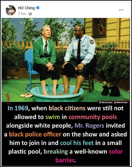 其中一集中,主角罗杰斯先生在炎热的夏季,主动邀请黑人朋友克莱蒙斯一同用冷水泡脚,用实际行动突破了种族之间的隔阂。