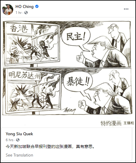 (观察者网 讯)新加坡总理李显龙夫人又“出手”了……6月1日晚,她在个人脸书账号转发了一组漫画,犀利讽刺美式“驰名双标”。