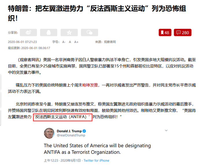当前美国的抗议与几方面因素有关,特朗普本人的火上浇油是一方面,黑人在新冠疫情期间面对的高死亡率、高失业率冲击是另外一方面,这两方面因素使得更多人对美国治理结构产生了怀疑。由于特朗普胡乱开炮,Antifa甚至可能在本轮抗议中获得同情和声援;由于Antifa缺乏组织结构,美国社交媒体一夜之间冒出了许多“反法西斯主义者”。