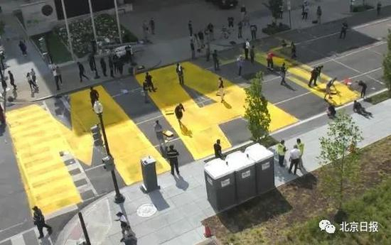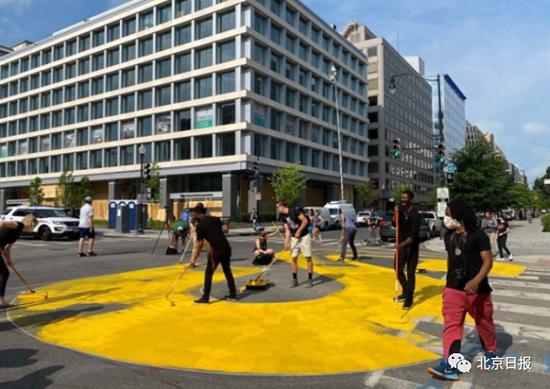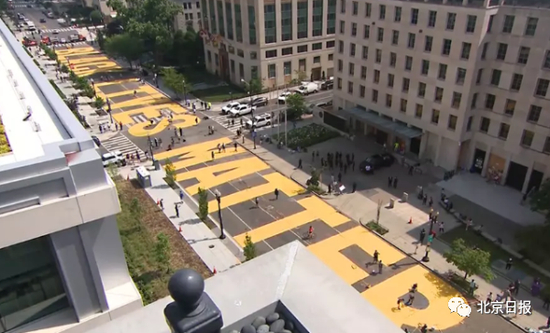 CNN指出,“黑人的命也是命”这一由16个粗体黄色字母组成的醒目大字跨越了第16街的两个街区,这是一条向南直通白宫的中轴线。字母的宽度达到了双车道的宽度,从高处看非常清晰,也很容易被航拍相机发现。