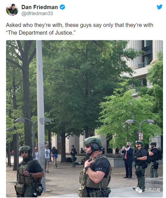 此外,据美媒报道,随着华盛顿示威活动的发酵,一群全副武装、未佩戴任何标识的执法人员于本周开始在当地街头巡逻。他们最近出现是在当地时间2日和3日,面对民众和记者的询问,这些人并没有给出明确答复,只称自己“来自司法部”。