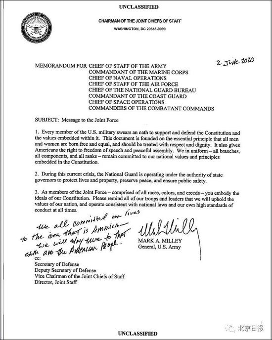 除了两任防长表态,参联会主席、四星上将米利也向美军五大传统军种、太空军首长以及各战区指挥官发布一份备忘录,称每一名士兵都曾宣誓支持与捍卫美国宪法及其中的价值观,包括“言论自由与和平集会的权利”。这被视作米利就近日国内局势及军方角色表态。