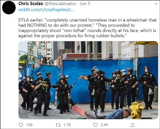(文/观察者网 龙玥)“弗洛伊德之死”引发的全美多城大规模抗议示威中,抗议者与美国警方之间不断发生暴力冲突,让局势越发紧张。近日,社交媒体中热传的几张在洛杉矶抗议活动现场的照片,再度点燃民众对警方“暴力压制”的不满情绪。